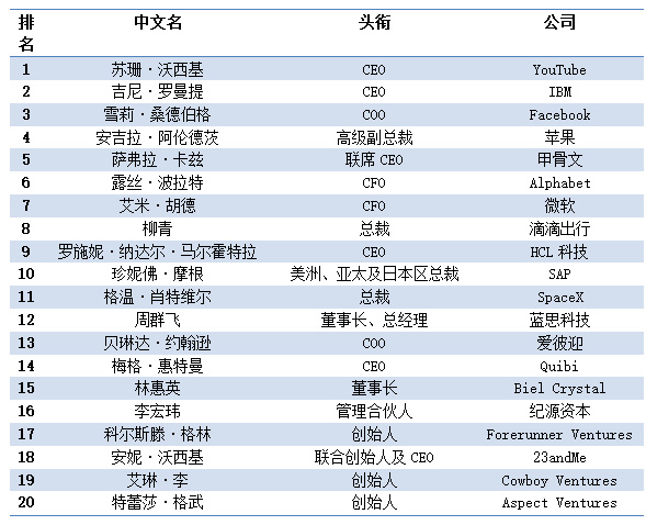 36氪讯,福布斯发布2018年科技行业最具影响力女性榜,YouTube首席执行官苏珊·沃西基位居榜首,IBM首席执行官吉妮·罗曼提和Facebook首席运营官雪莉·桑德伯格分列二、三位。此外,纪源资本管理合伙人李宏玮位列第16位,滴滴出行的总裁柳青在福布斯最具影响力女性榜上排名第46位。