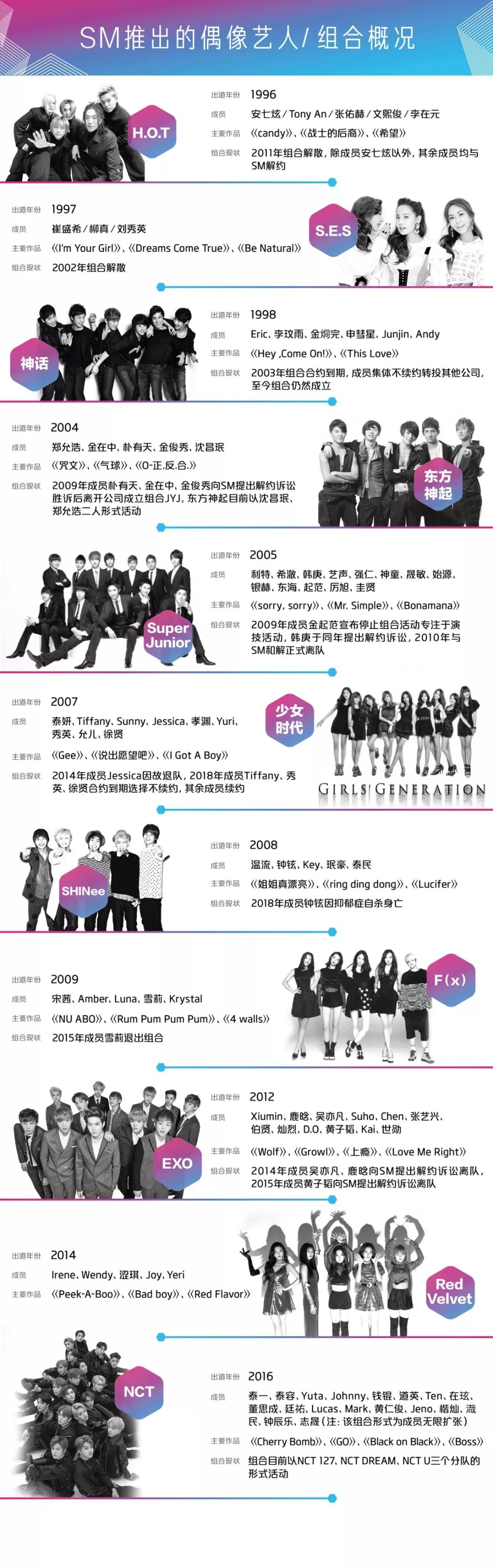 1995年李秀满将工作室改制成为了当前的SM Entertainment,在制作音乐的基础上,开始推出偶像组合。作为一家以偶像艺人经纪及音乐制作为主要业务内容的公司,以1996年公司推出了偶像团体H.O.T为起点,SM在偶像市场上已经耕耘了超过20年。