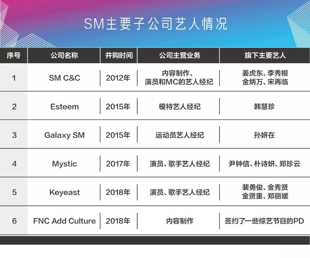 除了SM C&C之外,SM还并购了Mystic、Keyeast、FNC Add Culture等公司,将金秀贤、裴勇俊、朴诗妍等多位韩国知名演员的艺人经纪业务收入囊中。除了歌手、演员,SM还和针对运动市场的公司IB Sports联盟成立了Galaxia SM,以及和韩国国内的顶级模特经纪公司Esteem一起成立了战略合伙人关系,由此取得了孙妍在等韩国知名运动员以及众多韩国模特的经纪合约。
