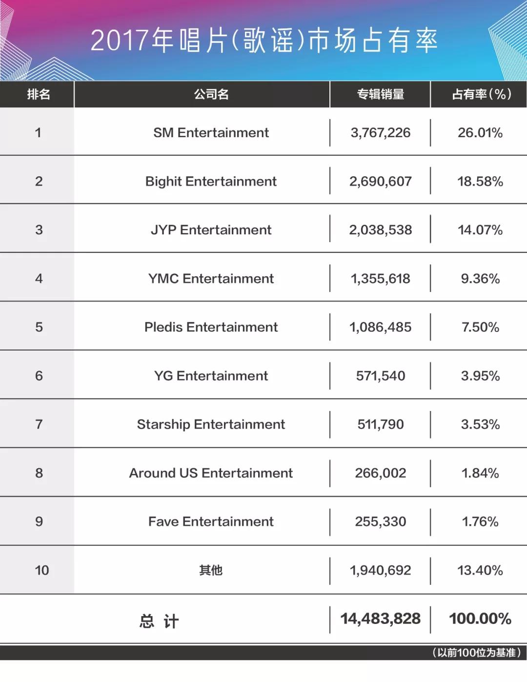当前,SM的市值超过了1万亿韩元(约61.86亿人民币),在韩国偶像艺人经纪公司中排名首位。2017年,SM的专辑销售量达到了3,767,226张,占据了韩国全年专辑销售量的1/4,排名市场一位。