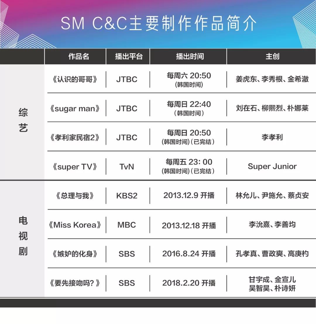 除了艺人经纪,SM也在利用子公司SM C&C进行影视内容和综艺的制作。随着旗下演员和MC的数量增多,SM开始利用艺人资源进行影视、综艺的制作。如当前韩国收视率颇高的综艺节目《认识的哥哥》就是由SM C&C制作的,在MC的选用上也可以看到旗下艺人姜虎东、李秀根和金希澈的身影。通过内容的制作,SM可以向更多项目输送自己的艺人,也可以收获艺人经纪以外的收入。