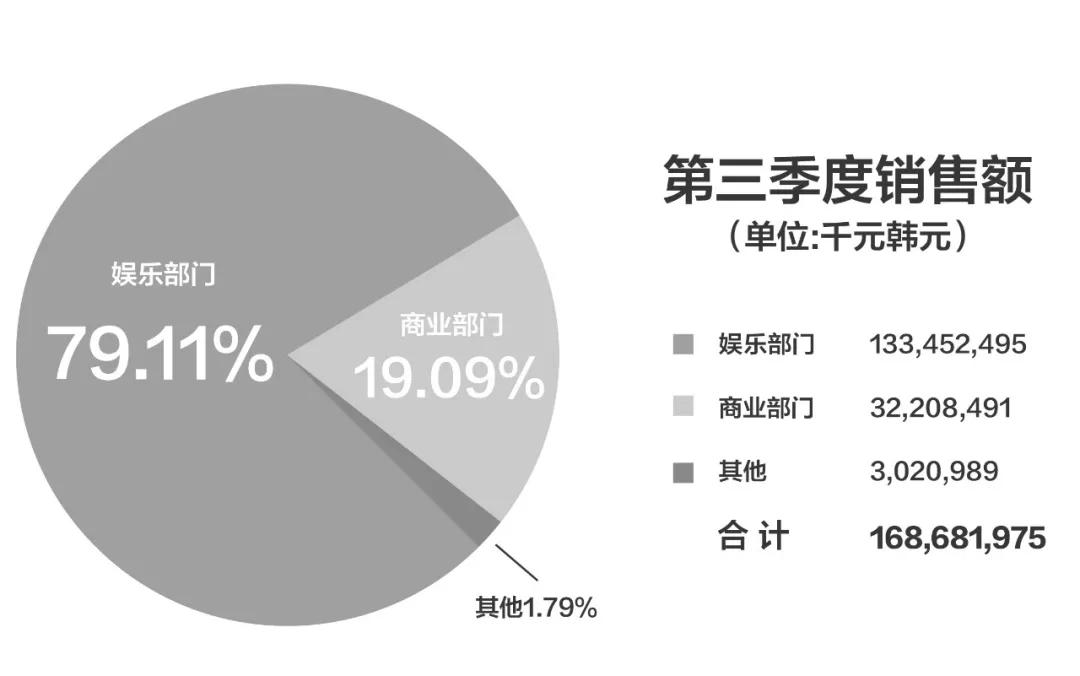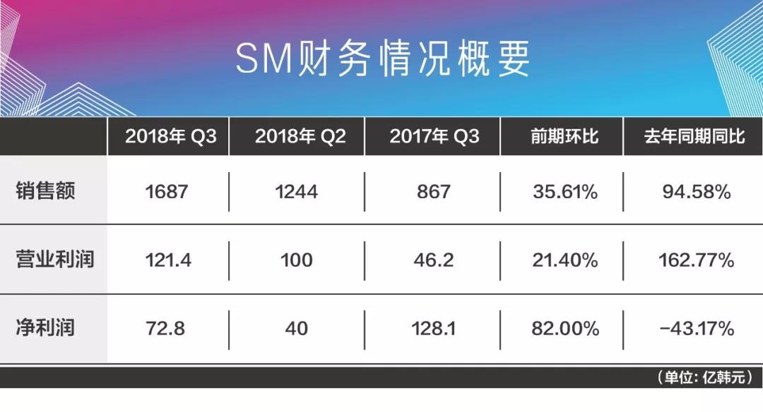 根据SM财报对部门的划分,2018年第三季度娱乐部门销售额为1334亿5249万韩元(约8.24亿人民币),其中音乐制作板块销售额为181亿8655万韩元,而艺人经纪板块销售额为475亿3531万韩元,在商业部门的销售额为322亿849万韩元。同时,受到第四季度旗下EXO、Red Velvet、NCT 127等多个团体发行专辑的影响,SM给出了更好的第四季度财务报告预期。