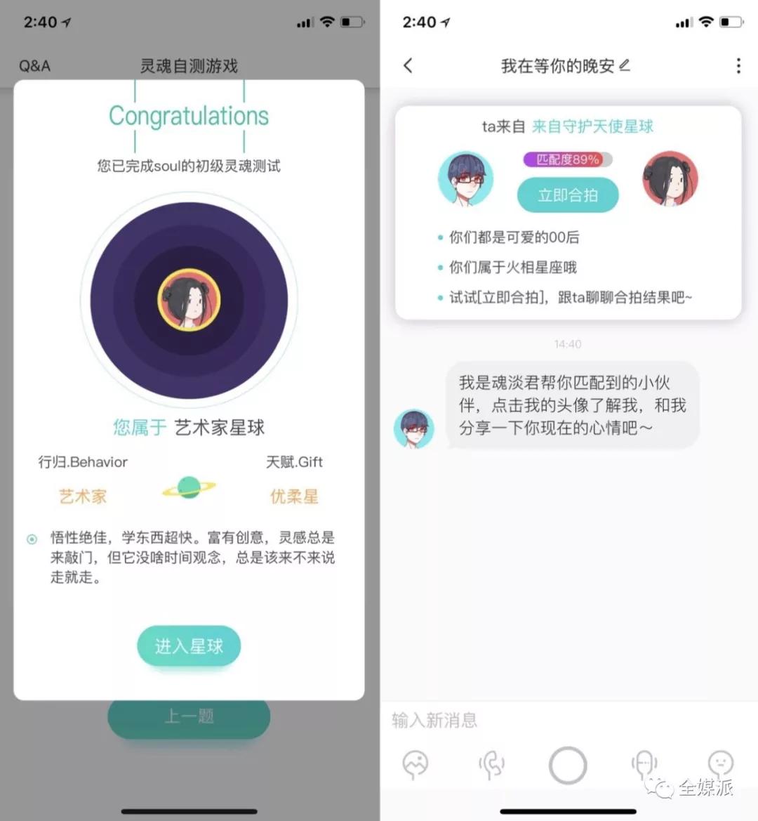 Soul是一款主打“灵魂”社交的软件,打开app后,首先在眼前展开的是详细的“灵魂自测游戏”,通过细致的测试,确定的灵魂属性,然后app根据你的特性为你精准推送交友的对象。这种“为了社交而社交”的app与音遇的随机入场形成反差。