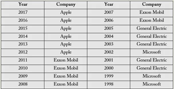 在过去的20年里,虽然有多间公司曾登顶全球市值最高的宝座,比如,亚马逊,但以道琼斯指数年终数据计算,榜首只留下过四家企业的名字:微软、通用电气、埃克森美孚和苹果。