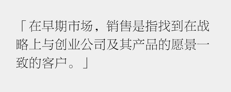 在早期市场,销售的真谛是找到那些对你的产品足够渴望的少数客户,只有这样的客户,才有足够的内部动力与创业公司展开合作,冒着可能会出现各种小毛病的风险,把一个尚未被证明的产品投入生产。