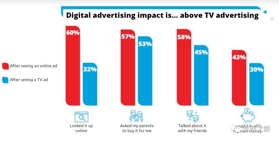 随着网络对亚太地区儿童日常生活的影响,网络平台也逐渐成为儿童发觉新玩具和新节目内容的重要渠道。有数据表明,网络广告的投放对儿童在搜索、向家长索要、与朋友讨论、自行购买等行为上的影响,均要高于传统电视渠道。