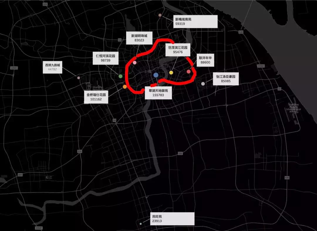 过去12年,上海房价平均涨了6倍左右,但细化到不同楼盘,涨幅差异极大。我们选择了2006年那时还有新房出售的10个小区,用新房开盘价作为基数计算到现在的涨幅。这些小区有市中心的,也有近郊的,下图是10个小区的分布图,图中红线是上海市中心的内环线。