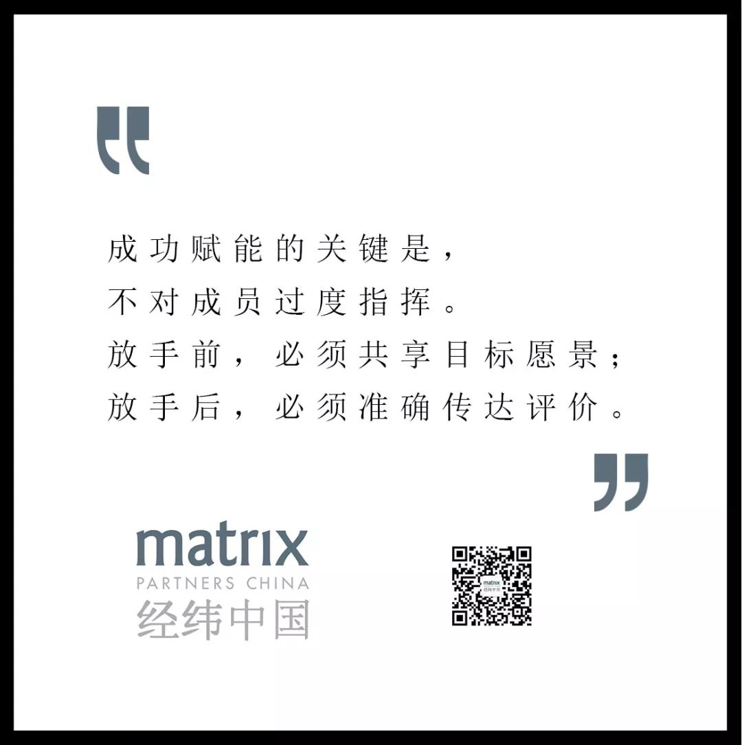 成功赋能的关键是,不对成员过度指挥。一旦把工作交托给了成员,就要有睁一只眼闭一只眼的勇气,懂得忍耐。当然,放手并不等于放羊,当成员偏离了根本目标或准则时,你还是要以建议或指导的方式帮助他修正。放手前,必须共享目标愿景;放手后,必须准确传达评价。