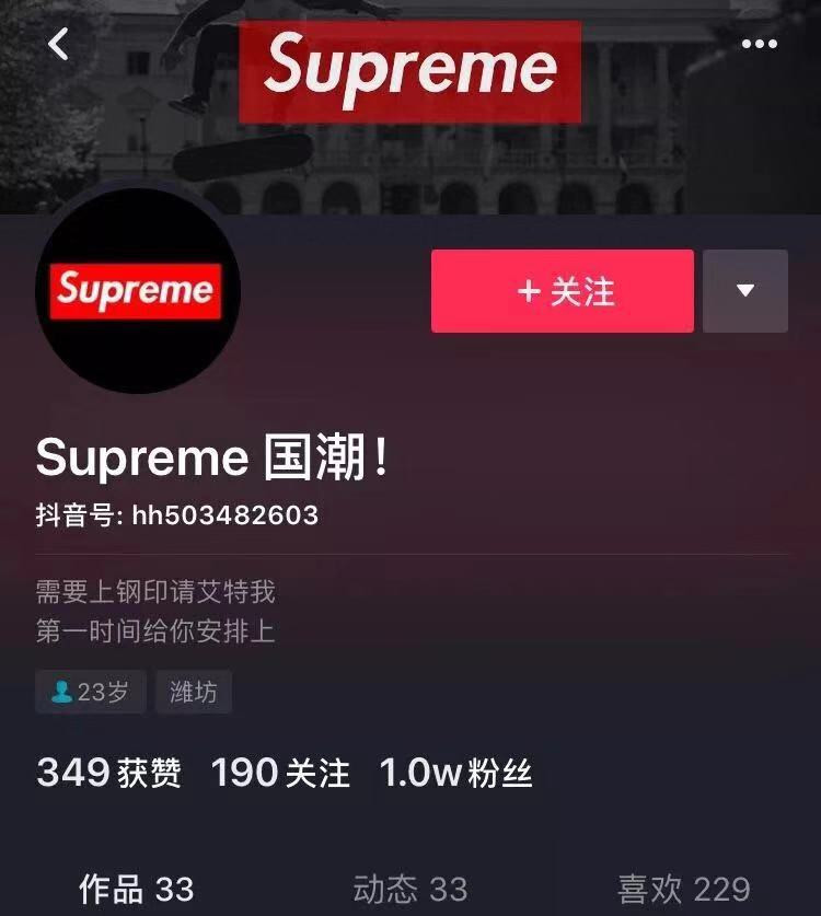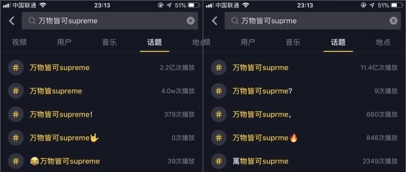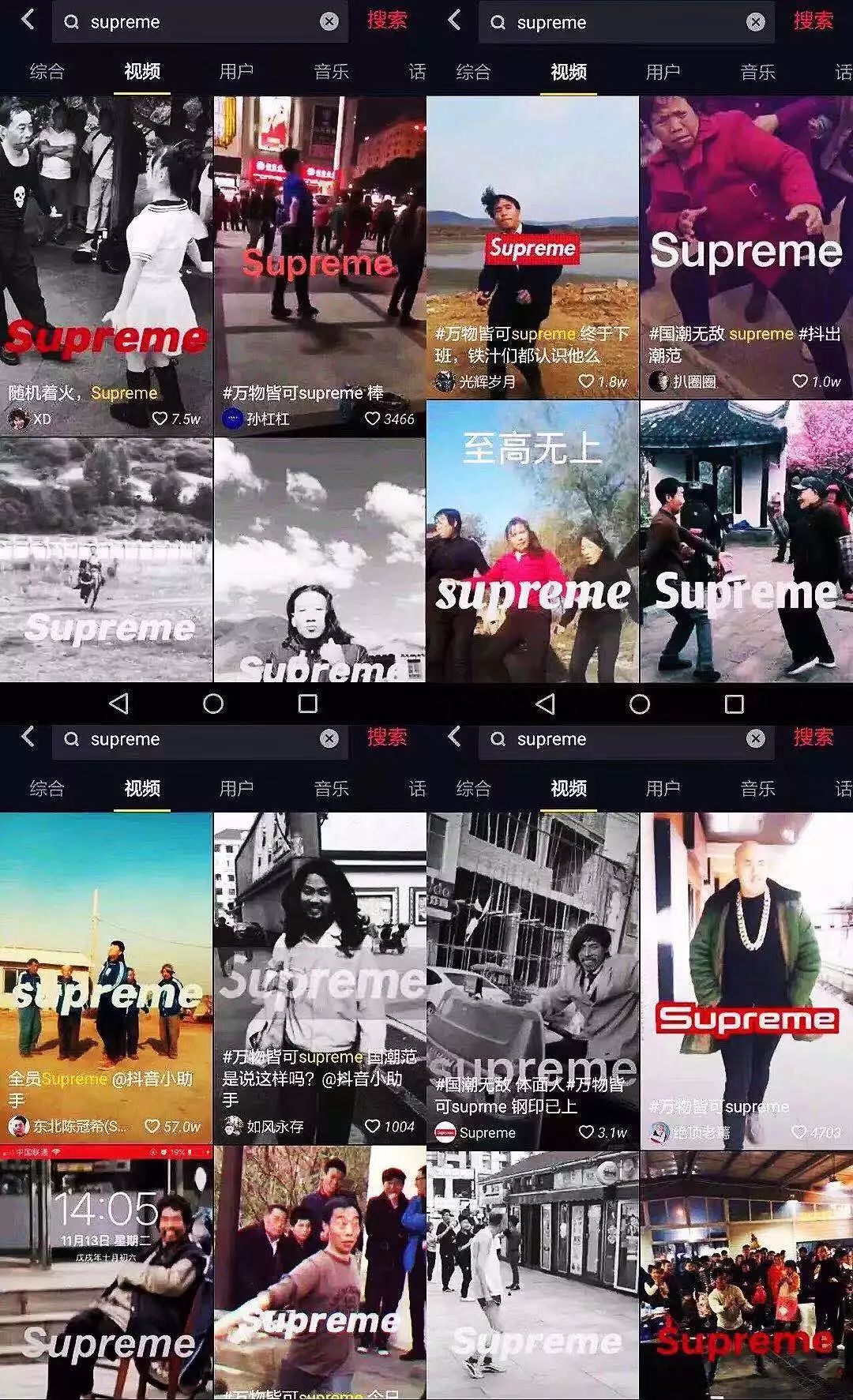 有趣的是,拼写错误的“万物皆可Suprme”比正版更火,播放量为 10.9 亿次。也就是说,“万物皆可Supreme”系列相关视频播放将仅仅在抖音已经超过13 亿次。