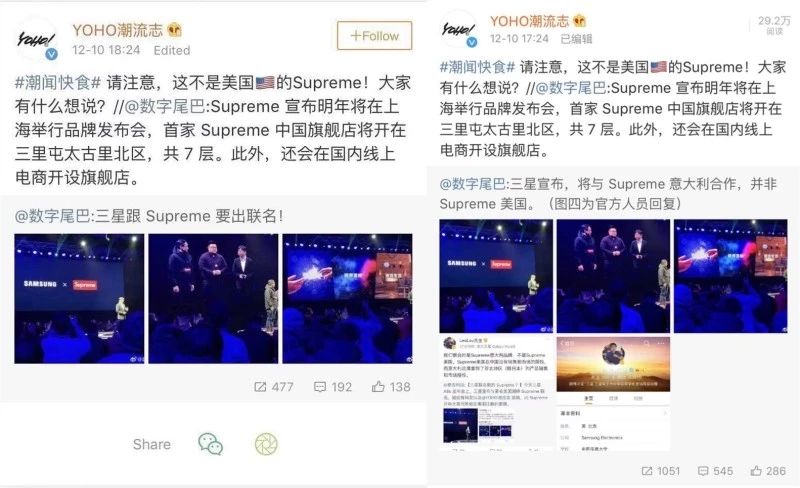 不过接下来,事情就发生了戏剧化转变。潮流杂志《yoho!潮流志》一个重锤,表示“这不是美国的Supreme”直接导致各路科技媒体的微博运营们忙不迭地开始编辑微博: