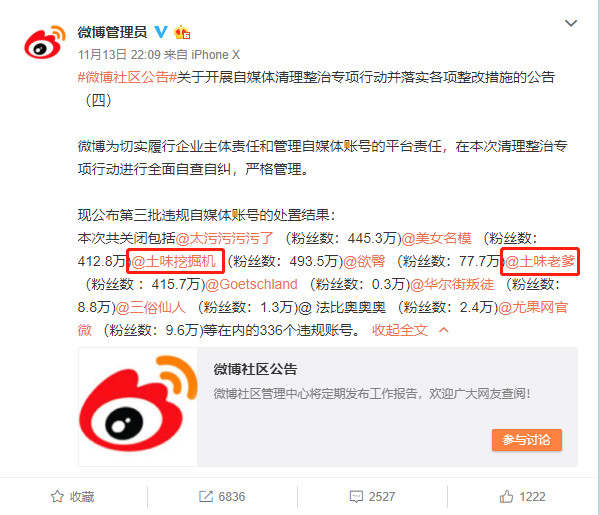 前有天佑牌牌琦,后有圣主雄鹰高飞、giao哥都是在通过他们影响到了“五环内”,成为不少人的快乐源泉。不过, 11 月 13 日微博管理员的一条公告中,“土味老爹”和“土味挖掘机”被认定违规,直接宣布死刑。