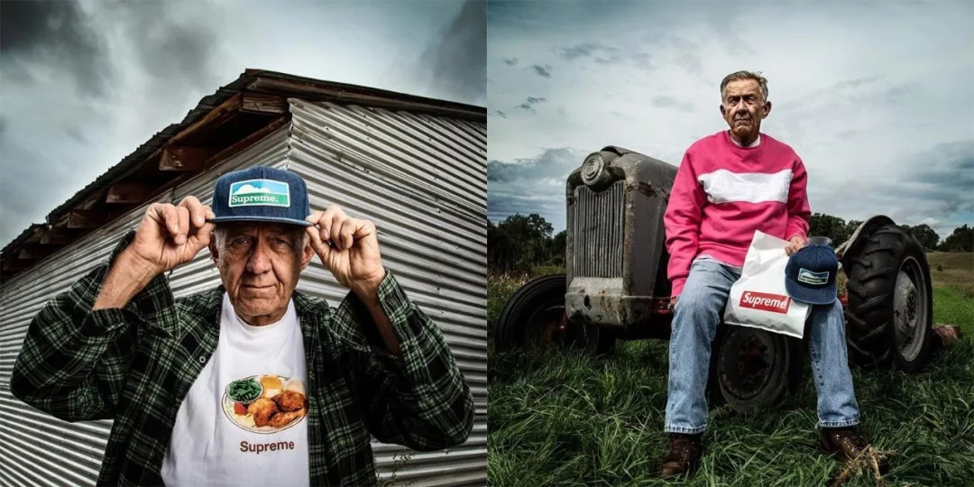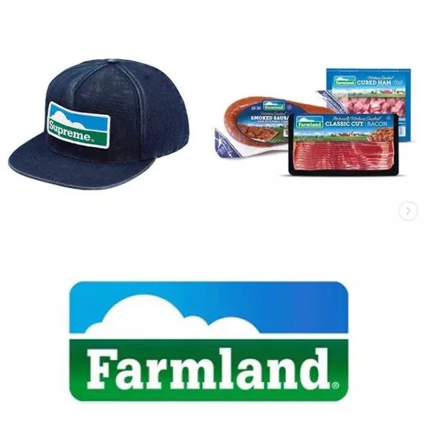 除了服装,Supreme 的灵感可能还来自各行各业。比如 2018 的秋冬款平沿帽,灵感来自美国一家猪肉加工厂 Farmland Foods,搞得气不过的老板让工人穿着 Supreme 来了一组 LOOKBOOK。