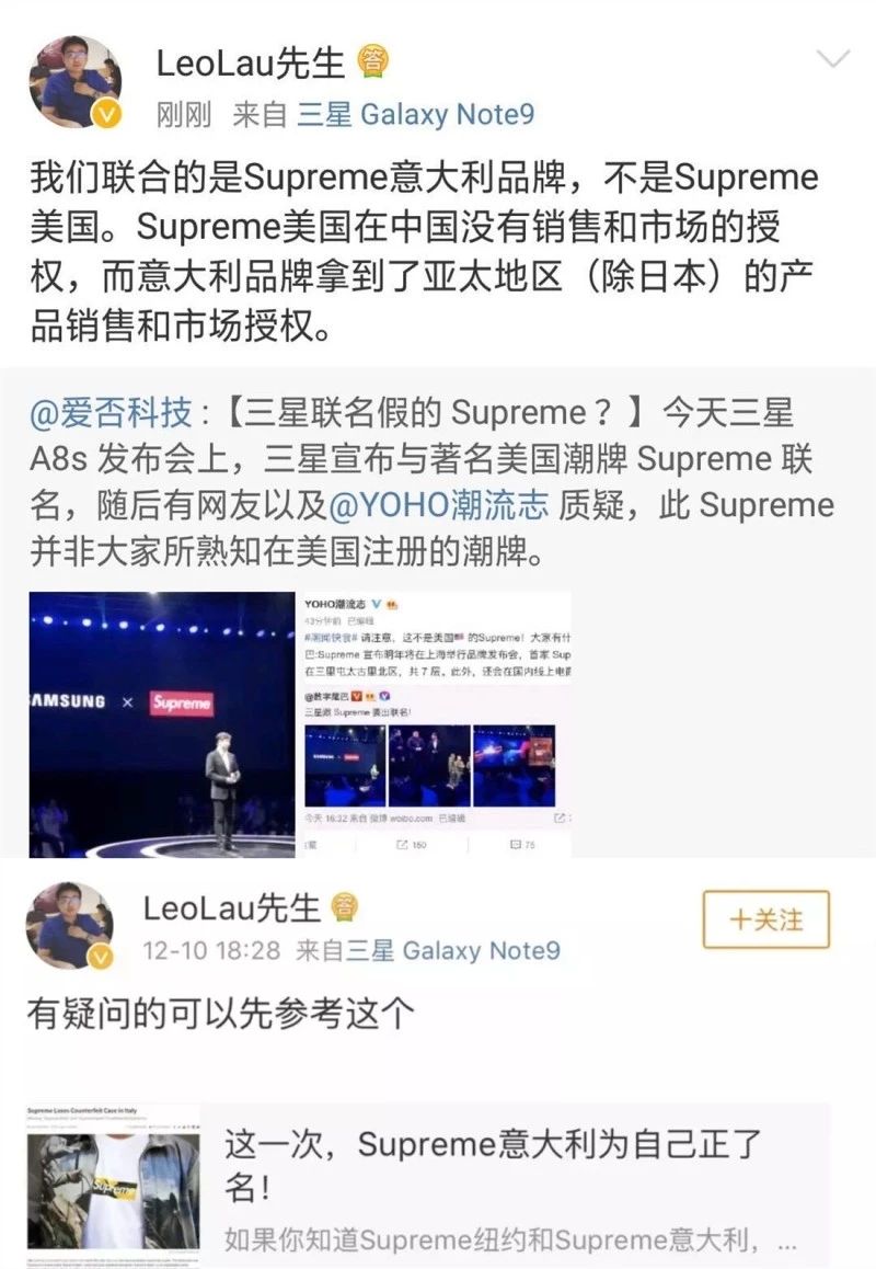 但是好玩的地方就在于,认证为“三星电子大中华区数字化营销高级经理”的“LeoLau先生”开始下场教网友做人了(两条微博现在均已删除):“我们的确是和意大利的 Supreme 合作的,但是你说他是假的那就是你不懂了。”