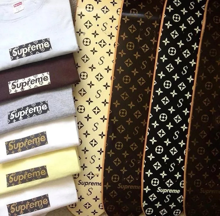 2000 年,在滑板圈子已经有相当知名度的 Supreme 又把“魔爪”伸向了 Louis Vuitton,直接把后者经典的 Monogram(老花)图案用到设计中,产品覆盖了滑板、帽子、T恤等。Louis Vuitton 哪儿受得了这种委屈,直接采取法律手段要求 Supreme 停售并召回相关产品。