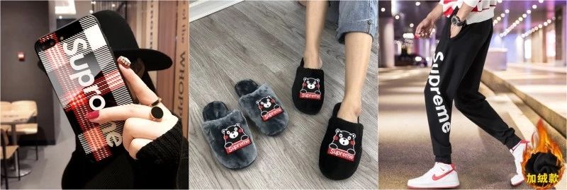 这一点去淘宝以“Supreme”作为关键词搜索一下就好,几十块圆你潮流梦一点不夸张。从 29.8 的手机壳,到 58 块一双的 Supreme × 酷MA萌“联名”拖鞋,再到 139 块的加绒卫裤,Supreme 的“业务范围”大到你无法想象。