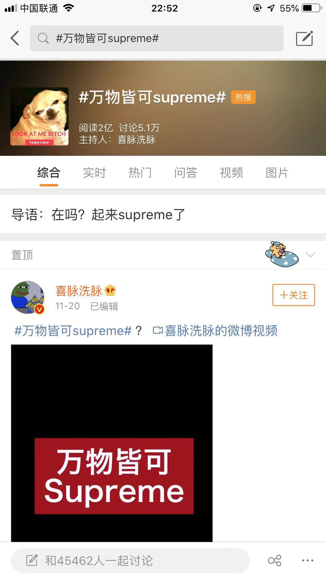 洗脑事件的策源地虽然是抖音,但是“万物皆可Supreme”还是突破了次元壁,在微博话题阅读量也已经突破了 2 亿。