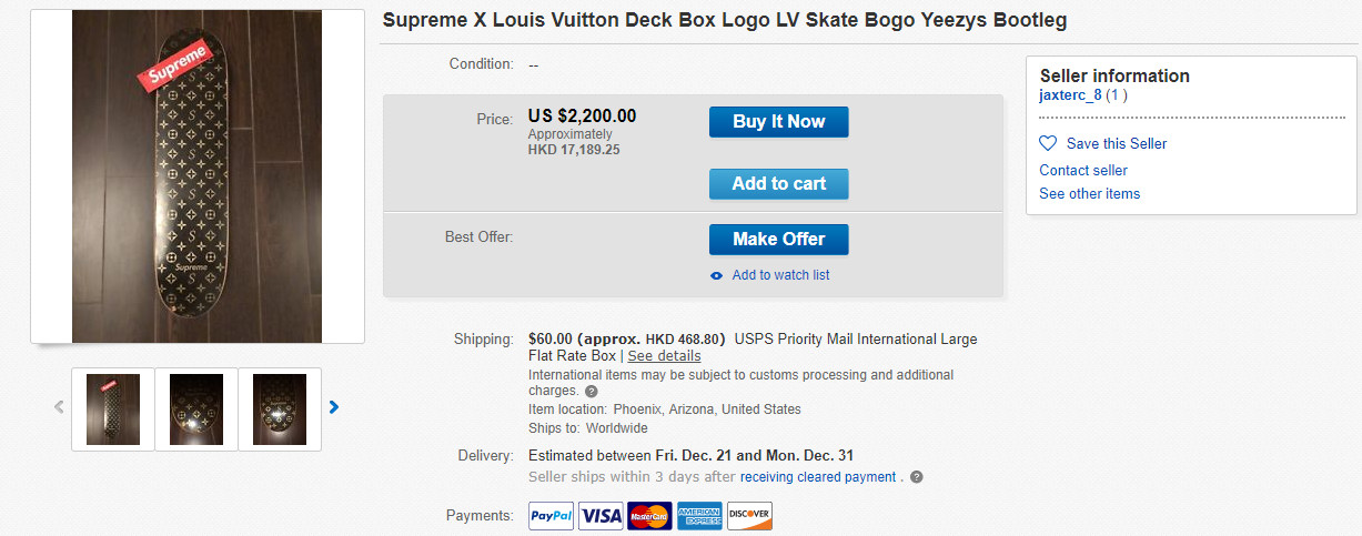 不过,对于 Supreme 的影响并不大,已经售出的“联名”产品在二级市场上瞬间成为了抢手货。截止到发稿前,当年的那块滑板目前在 eBay 上仅剩一块,售价高达 2200 美元(约合人民币 15121 元);更别提,这一次之后,Supreme 的知名度迎来暴涨。
