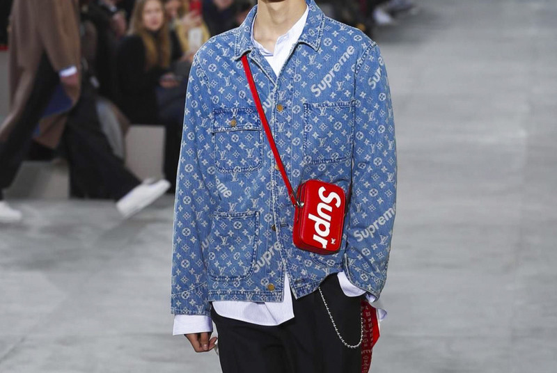 品牌联名是 Supreme 固定的设计套路,每一季的 Supreme 都通过各路联名提高了热度。比如前不久与 Louis Vuitton“冰释前嫌”后推出的联名系列,全都炒上了天价。