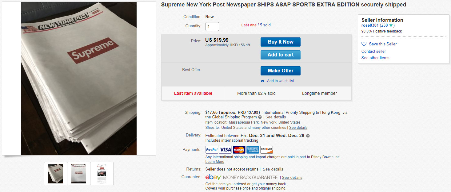 今年 8 月,为了给即将发布的 2018 秋冬系列造势,Supreme 在《纽约邮报》8 月 13 日周一的报纸头版投放了广告,一贯的标志性 LOGO。原价 1 美元的报纸,引起了疯抢。截至发稿前,eBay 的价格炒到了 19.9 美元(约合人民币 137)一份。