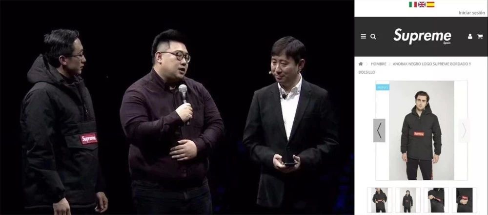 这就显然是把吃瓜群众的智商按在地上摩擦了。一个诞生在美国纽约的滑板品牌,在您这成了意大利品牌。那也成,那您给解释下发布上左边这位哥们儿身上的“西班牙 Supreme”又是怎么一回事?这可是板上钉钉的知名李鬼。