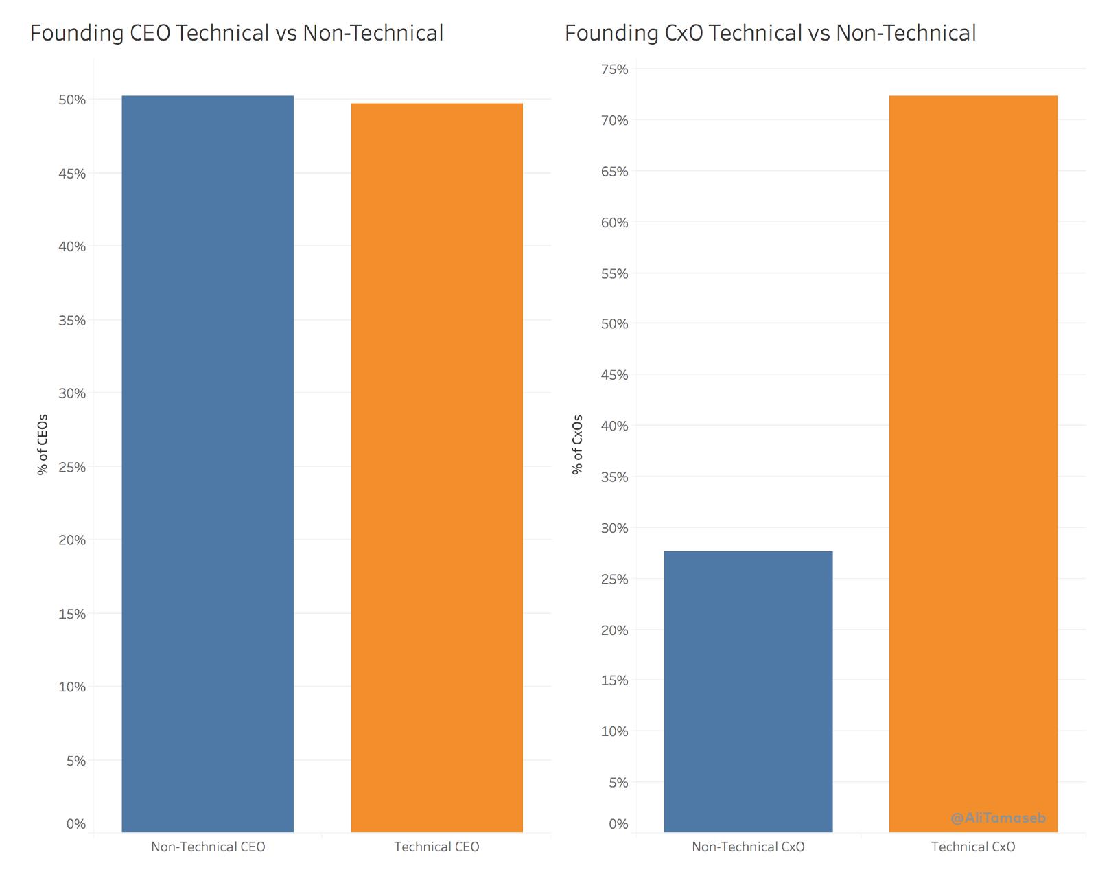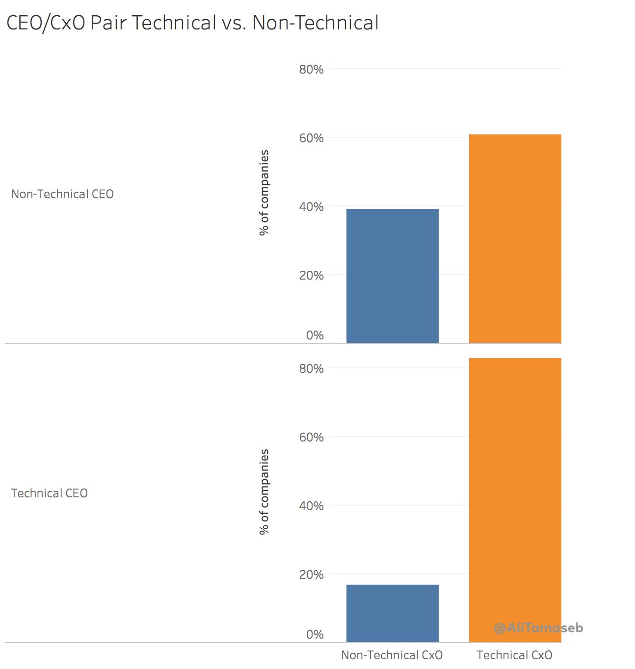 虽然有点违背直觉,但当CEO是非技术出身时,CxO也更有可能是非技术出身的。