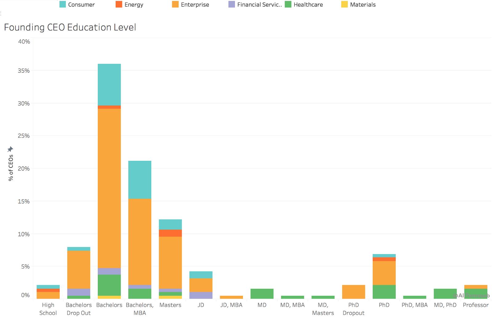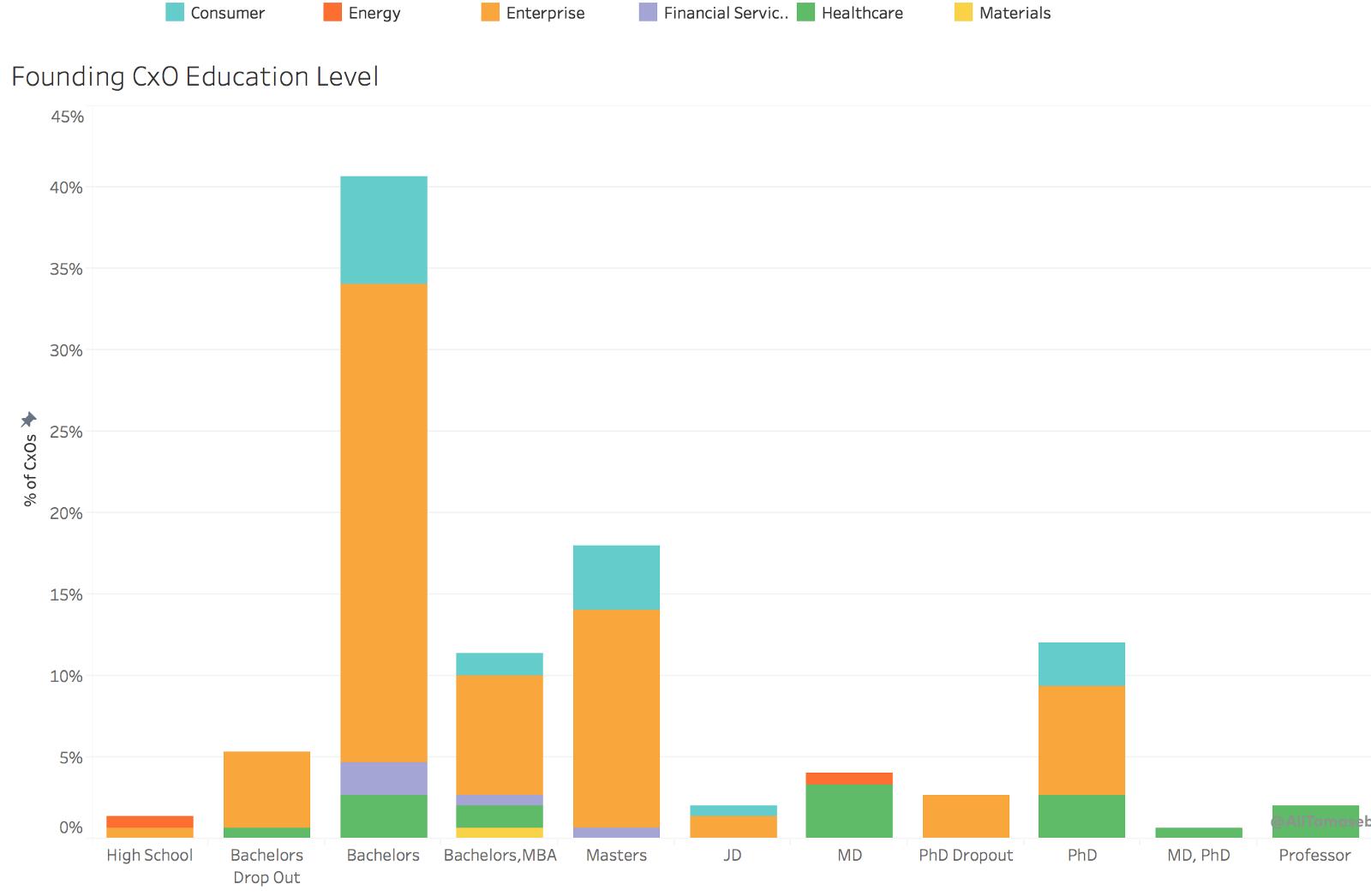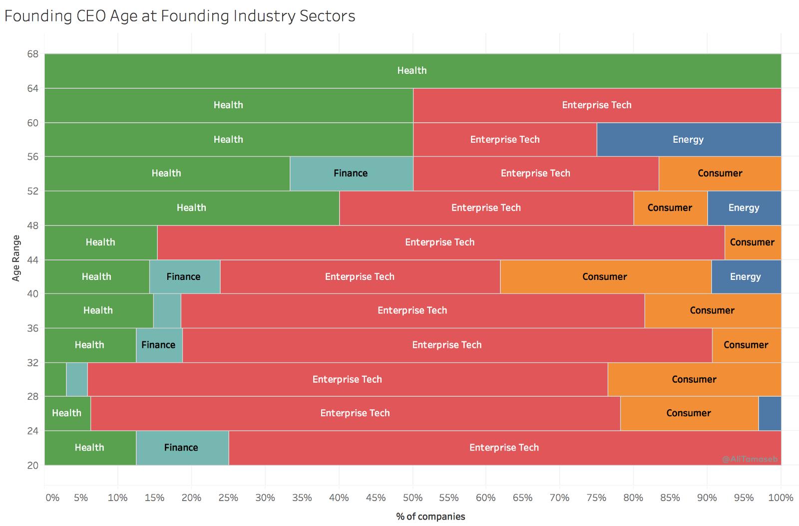 如上所述,年轻的创始人大多在企业SaaS领域,而年长的创始人大多在医疗保健/生物技术/制药或能源行业。消费领域的创始人在任何年龄段都有(这与只有千禧一代的误解相反)