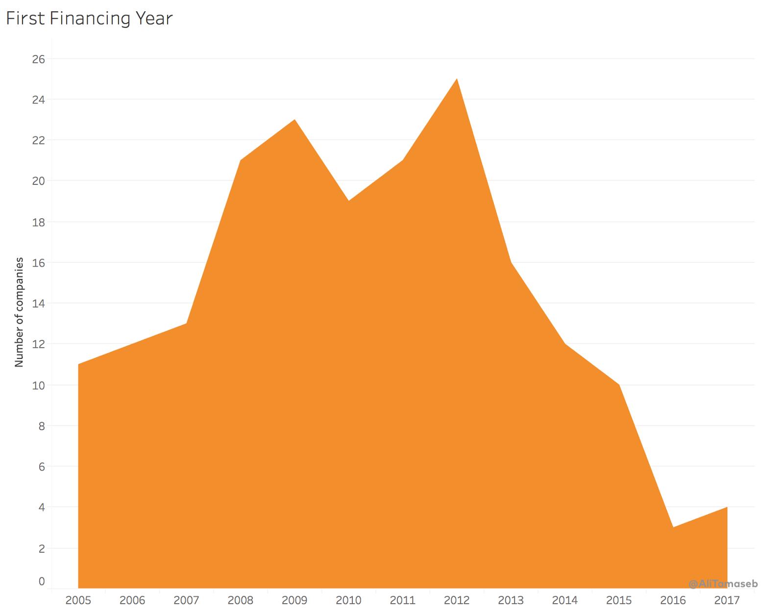 2013-2016年,这些公司的数量逐渐减少是很正常的,因为它们还没有时间成长为一家估值10亿美元的公司。有意思的是,2017年有超过数10亿美元估值的公司出现。