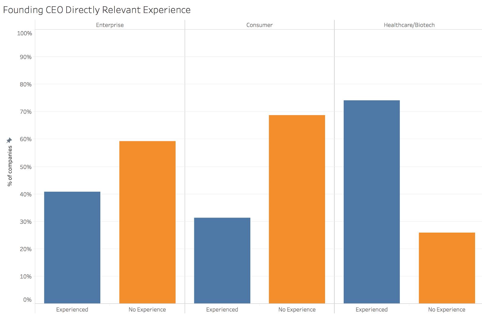 然而,在医疗保健和生物技术领域,情况并非如此,在这两个领域,近80%的创始人CEO都有直接相关的经验。