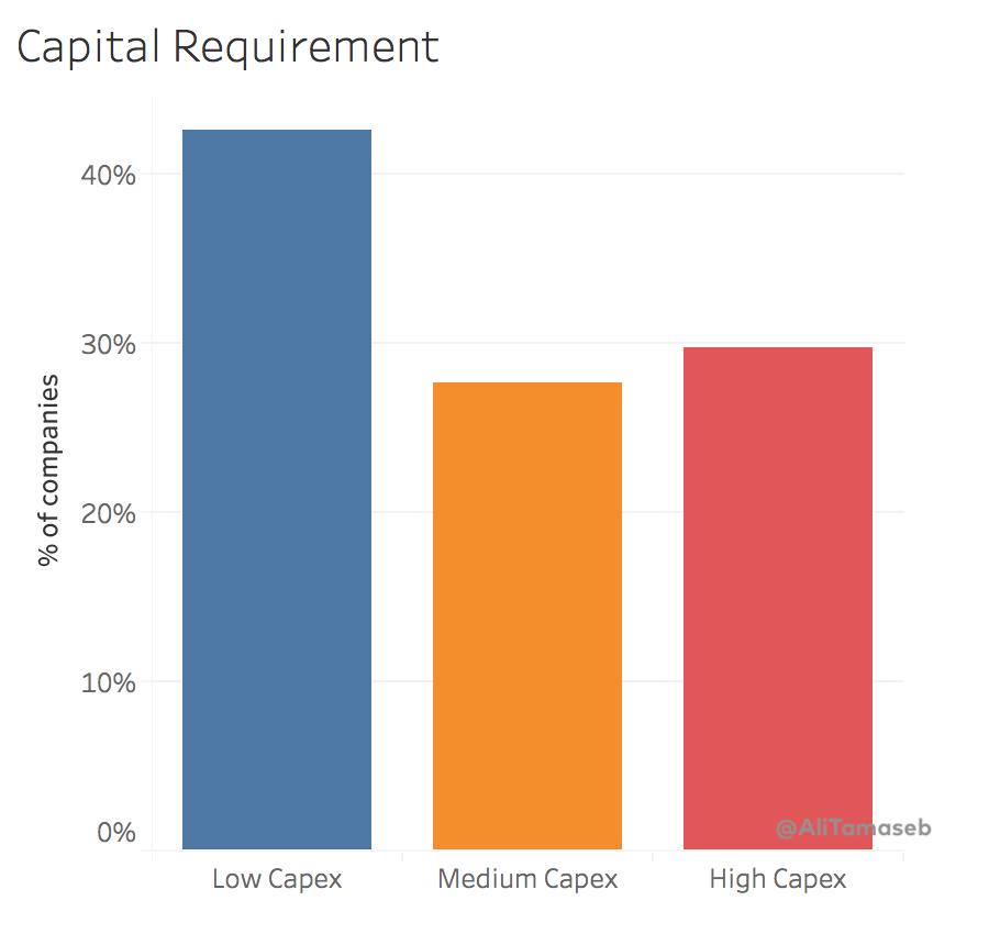 与认为这些公司资本密集度低的观点相反,与所有创业公司相比,需要大量投资来建立(扩大)解决方案(产品)的估值数10亿美元的公司占据了不小的比例。