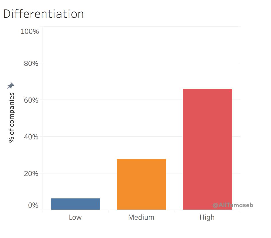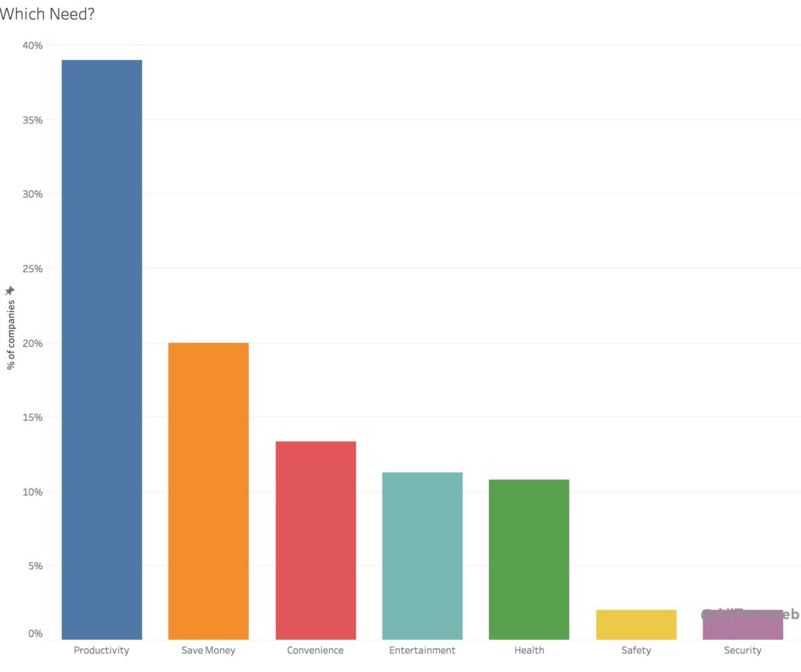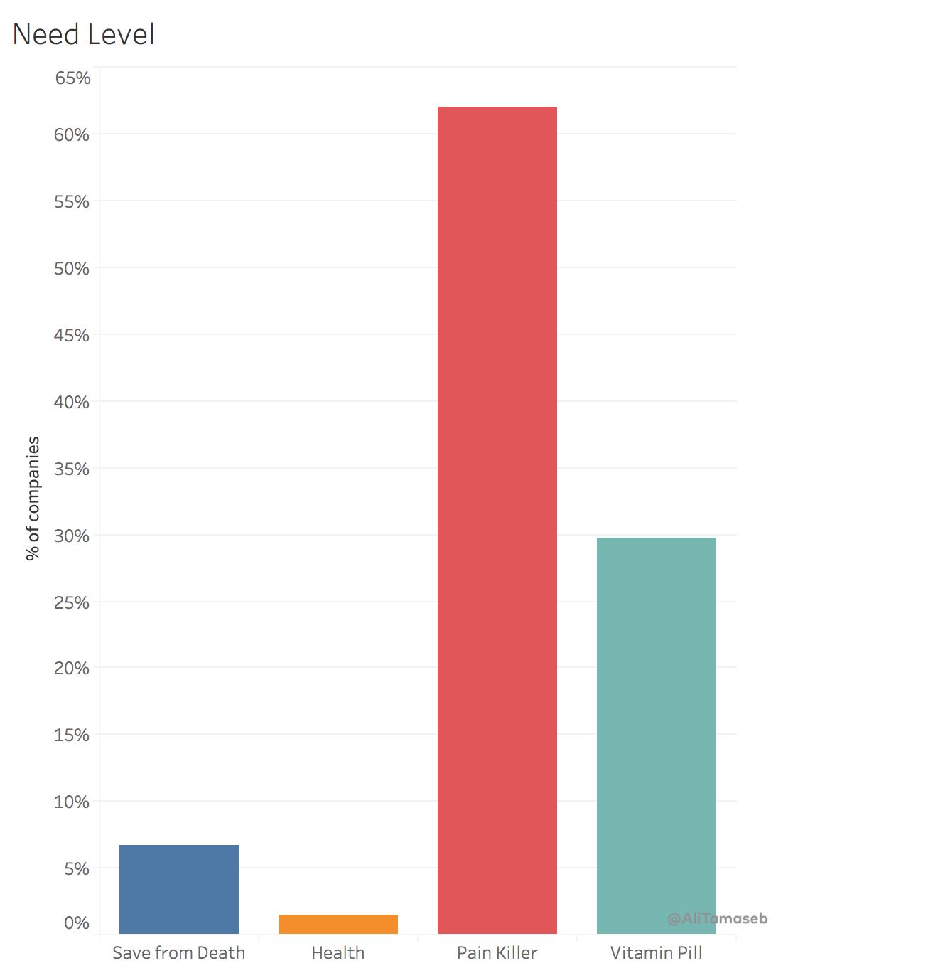 超过60%的公司正在消除一个明确的痛点。大约30%的公司只是简单地把事情做得更好(也就是说,你可以在没有它们的情况下生活/工作,但是它们会显著改善你的生活/工作)。