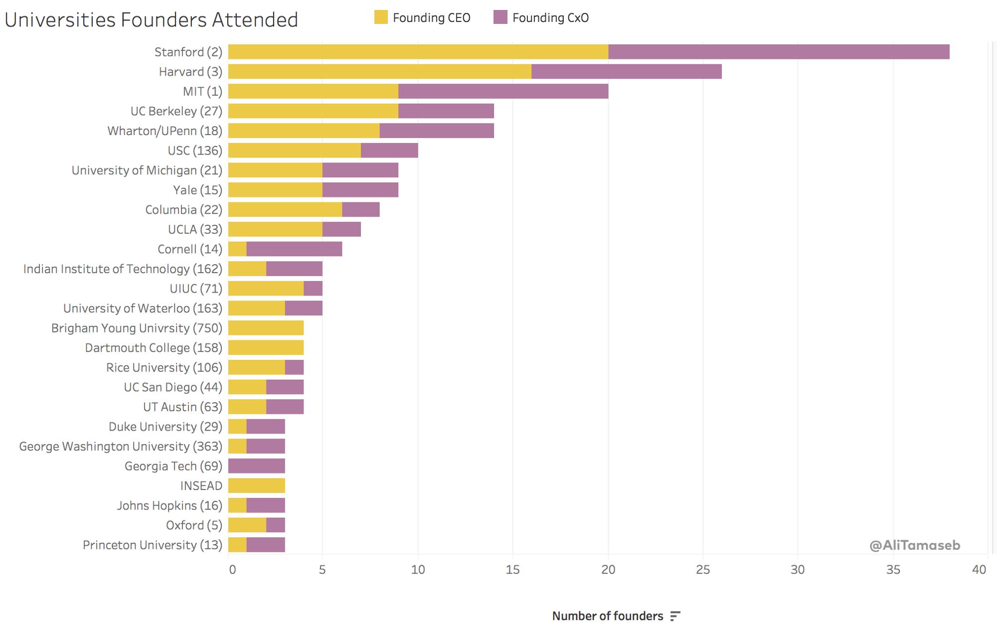 哈佛培养的CEO更多,麻省理工培养的CTO更多。然而,考虑到他们的排名,一些大学脱颖而出(括号中的数字显示了每所大学2018年的QS全球排名)。例如印度理工学院、滑铁卢大学、杨百翰大学和达特茅斯学院。 黄色代表CEO,紫色代表CxO。