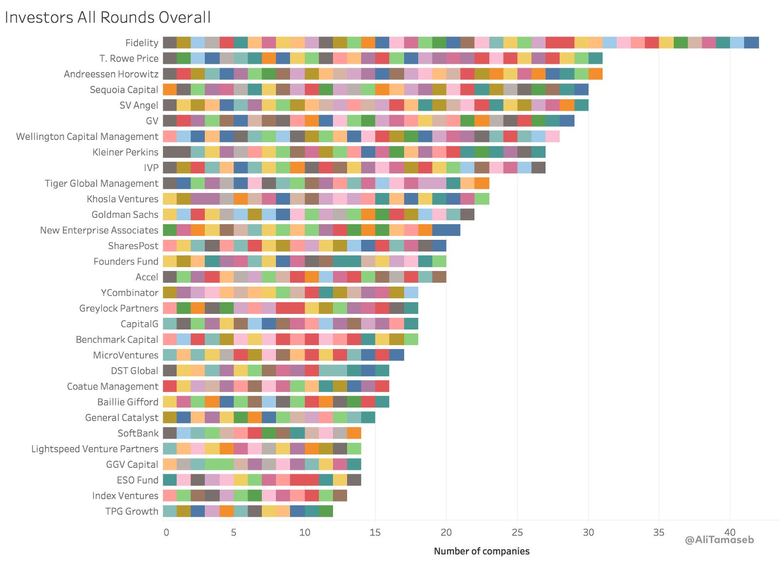 考虑到所有的投资轮次(早期和后期),拥有更多资金并能在后期投资的风投公司,投资了更多估值数10亿美元的公司。请注意,下面的数字来自于公开信息,可能有错误。