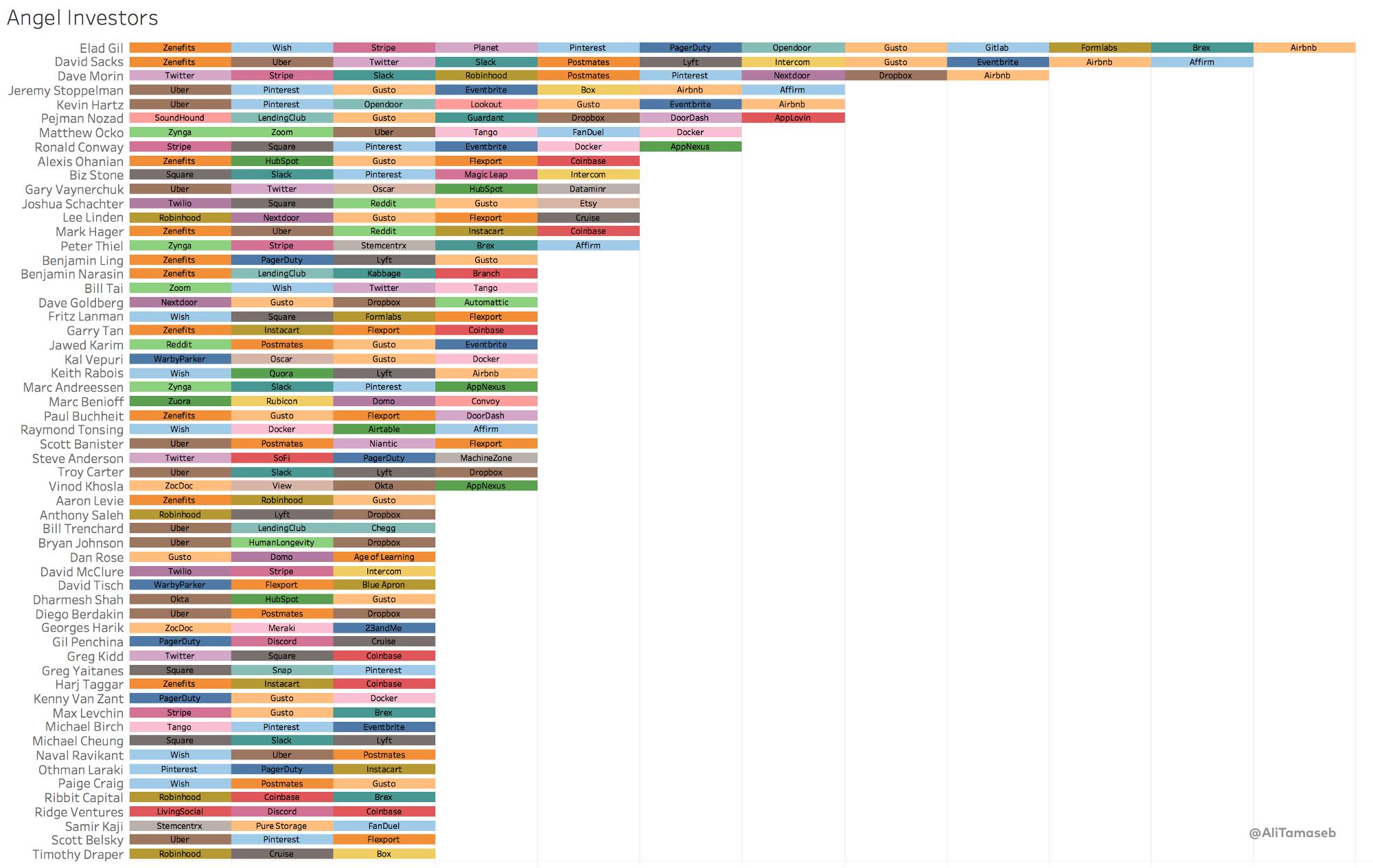 请注意,其中一些人也是风险投资者(或者后来成为风险投资者) 。不过,下图只显示了他们个人投资的公司,不代表风投公司。