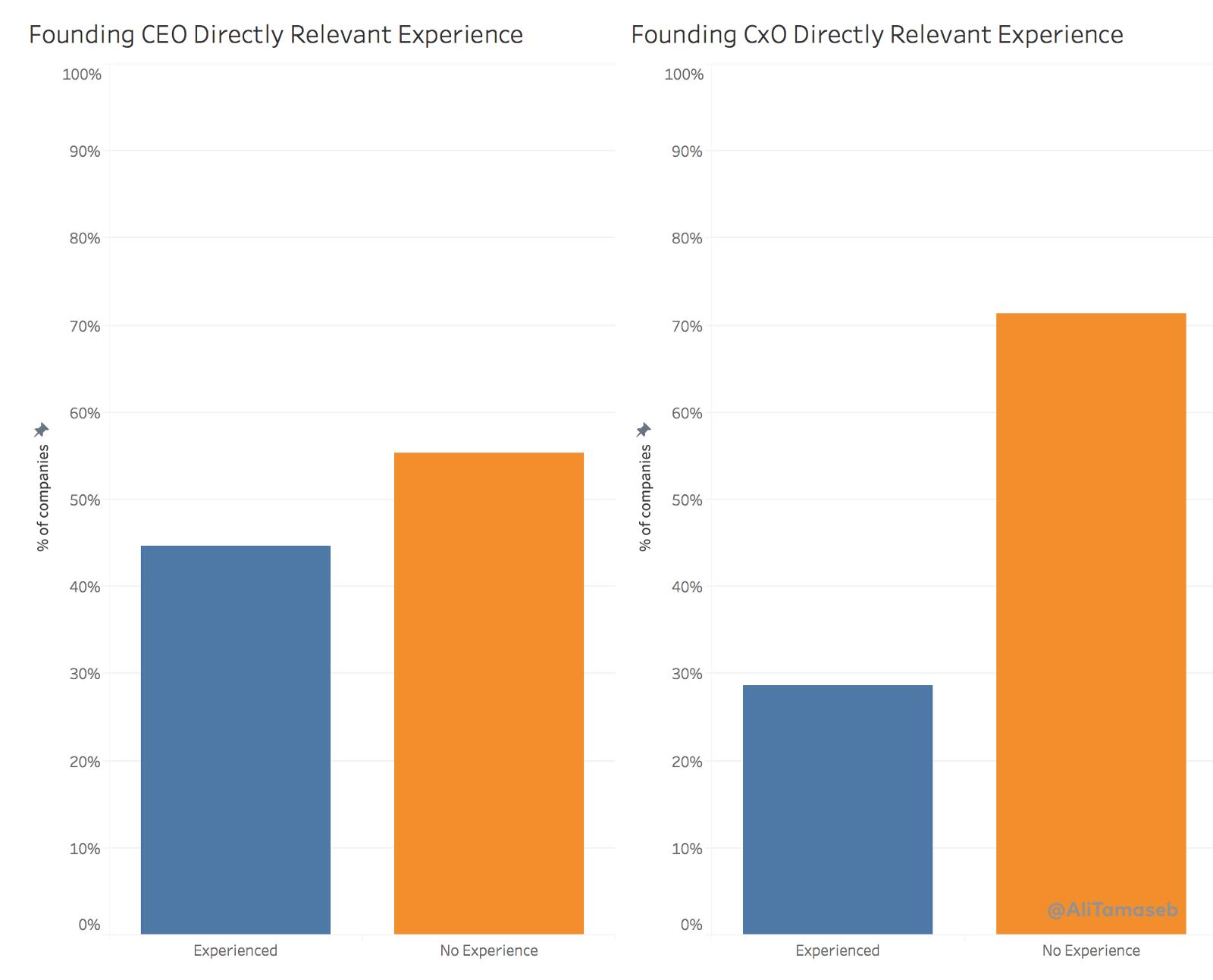 与流行的观点相反,大多数创业者在他们“破坏颠覆”的行业中,没有任何直接相关的工作经验。 CEO和CxO之间也有明显的区别,因为行业经验与CxO的相关性更低。