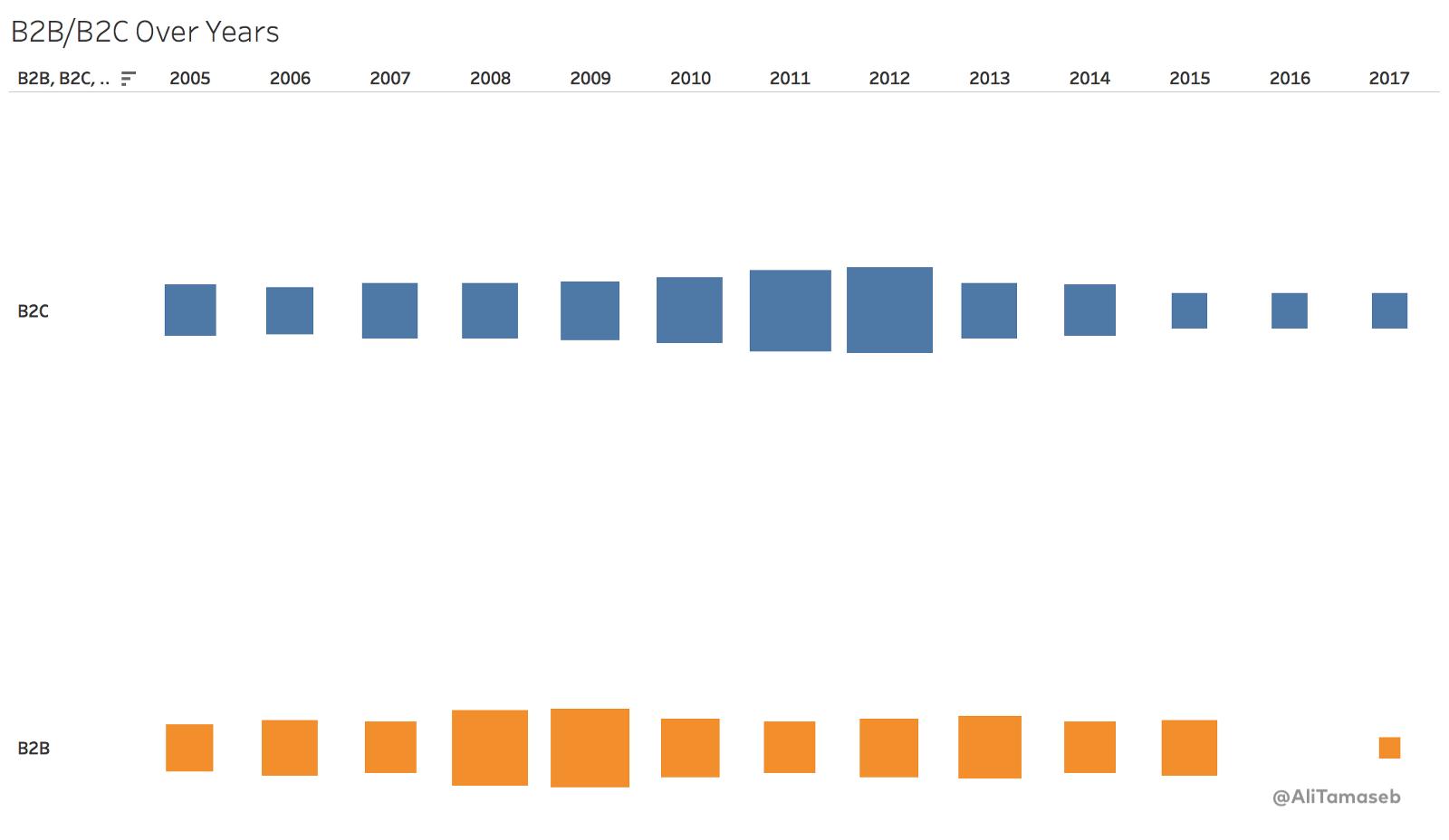 总体而言,B2B和B2C公司的数量差不多,在企业级市场,成立于2008-2009年的数10亿美元估值的公司最多,在消费者市场,成立于2011-2012年的数10亿美元的公司最多。