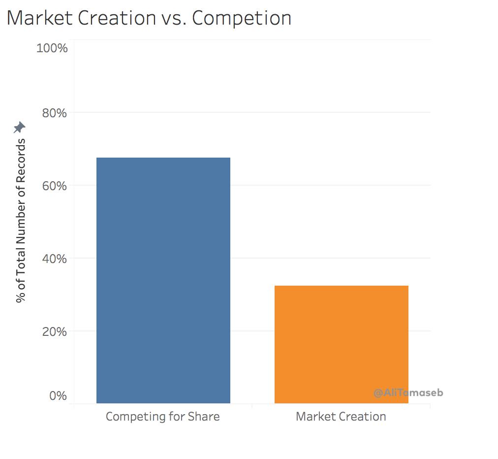 33、在超过65%的案例中,它们的目标,是从别人那里获得市场份额,而不是创造一个新的市场