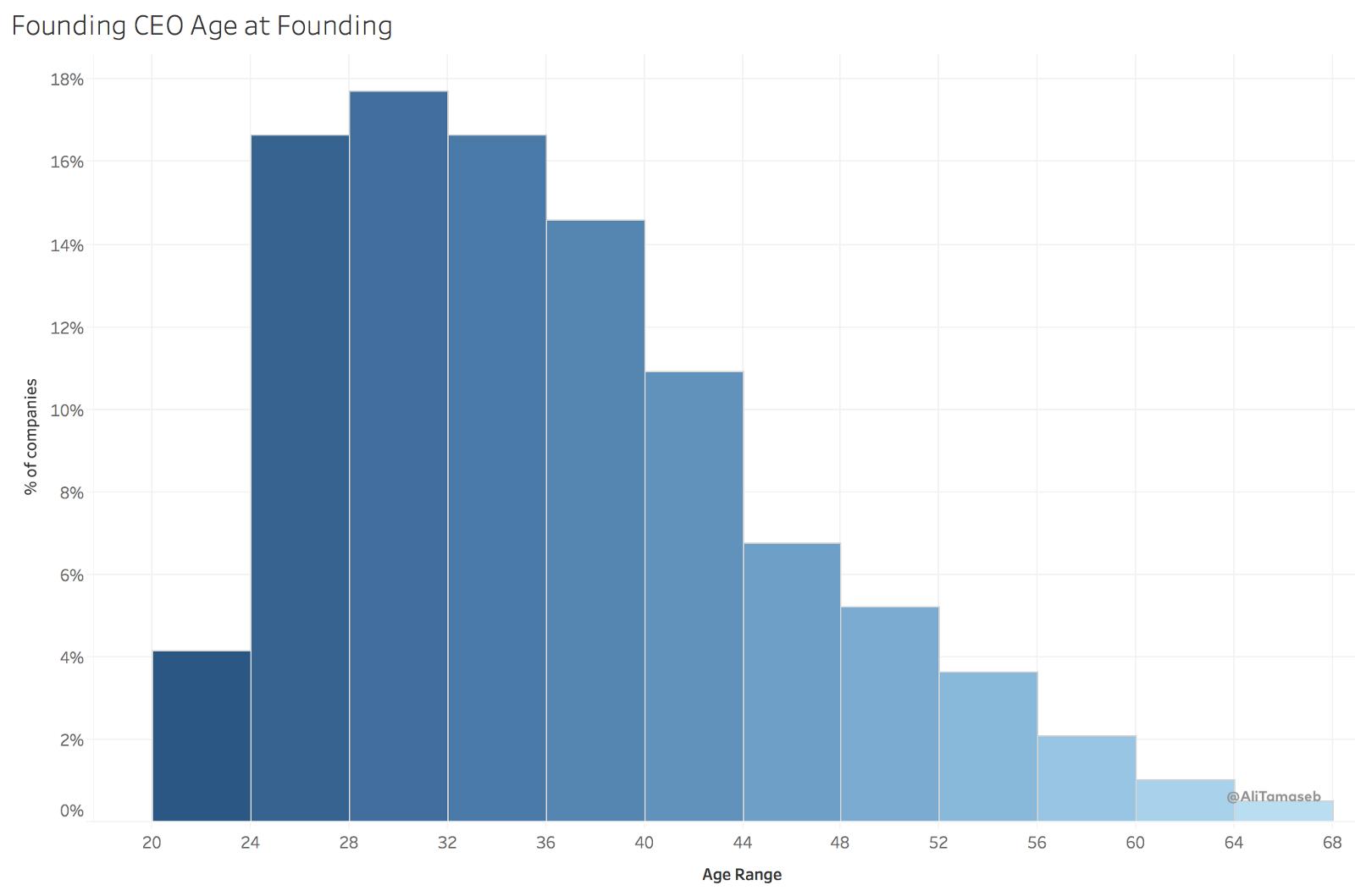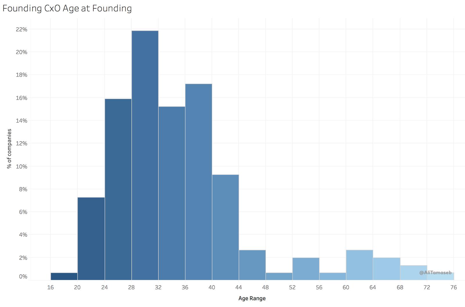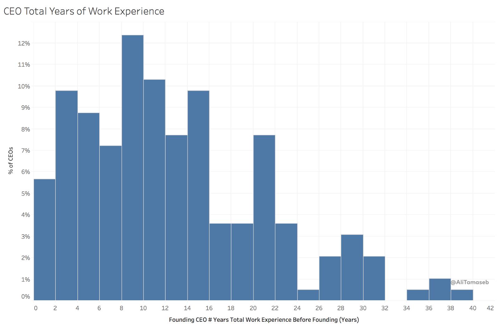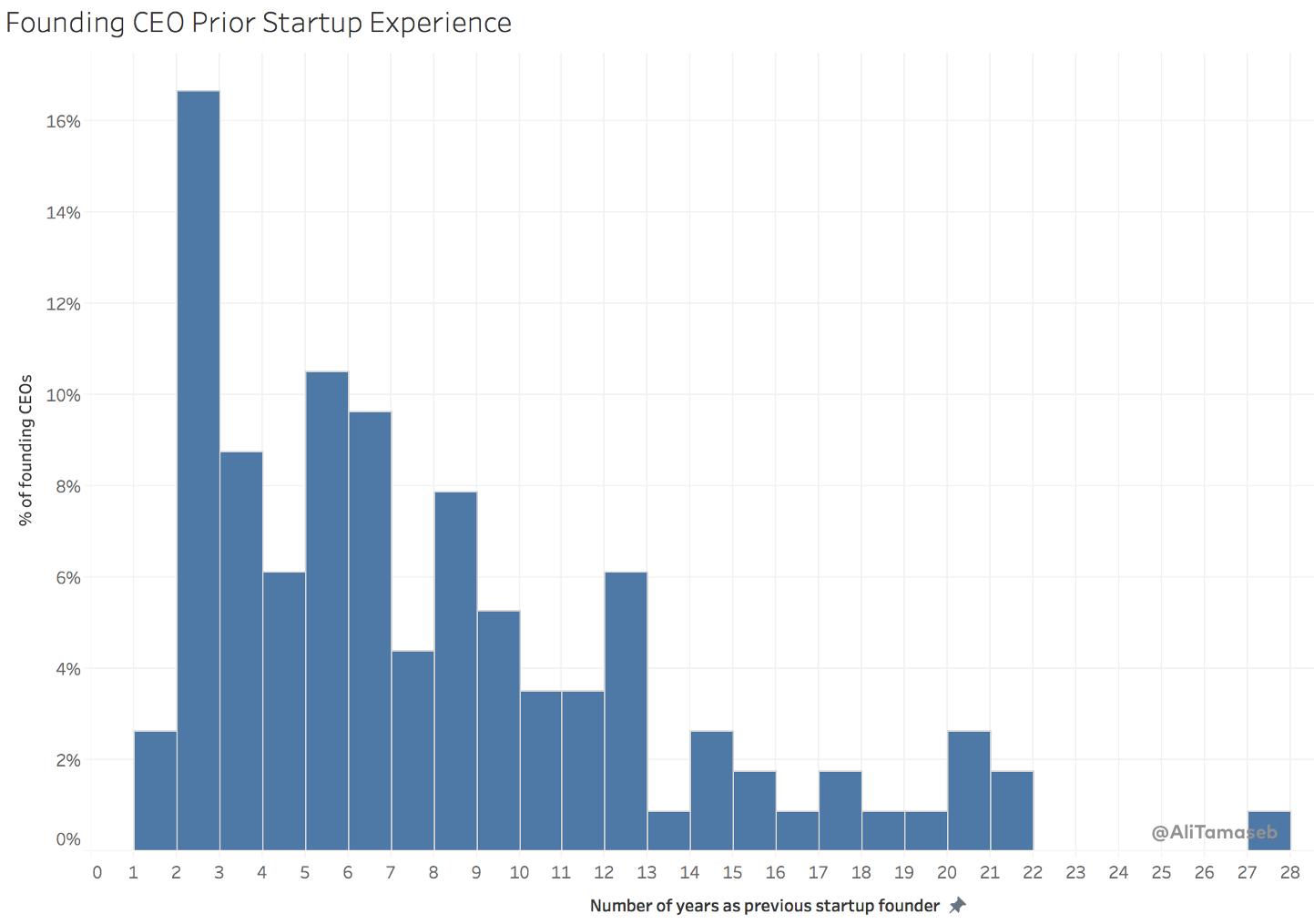 这个分布范围很广泛,许多人在创办估值数10亿美元的创业公司之前的2-3年都是创始人。一些人创办了多家创业公司,并领导他们20多年。对他们中的许多人来说,他们的第一家甚至第二家创业公司都失败了。