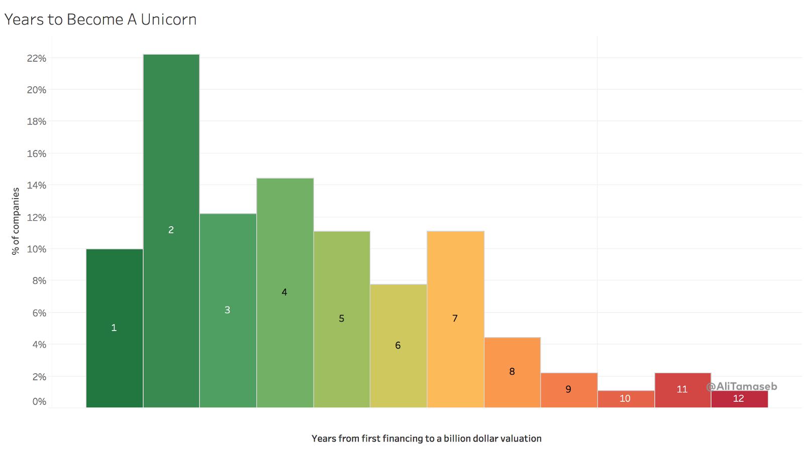 还有些公司在不到一年的时间里,就成了独角兽,有些公司花了十多年时间才达到10亿美元的估值。