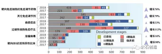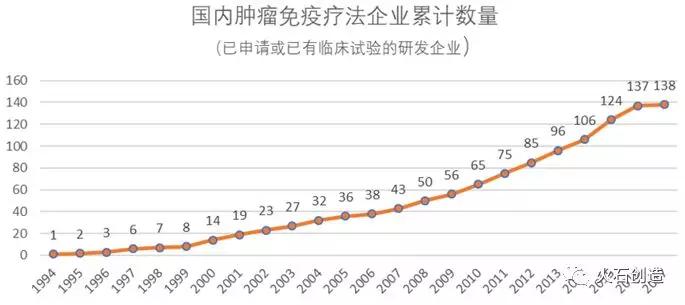 今年国内布局肿瘤免疫疗法研发的创新型企业增长迅速,据不完全统计,2017年全国已申请或已有肿瘤免疫疗法临床试验项目的企业已达138家,呈逐年上升趋势。