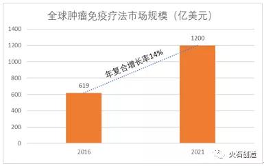 在癌症治疗手段中,免疫疗法是最受关注,具有疗效好,副作用小和防止复发等优点。免疫疗法的出现不仅在革命性地改变癌症治疗的标准,同时也革命性地改变了治疗癌症的理念,被称为继传统化疗药物、靶向治疗肿瘤治疗的第三次革命。目前肿瘤免疫疗法还在起步发展期,是朝阳产业中的朝阳产业。据EvaluatePharma数据显示,2016年全球肿瘤免疫疗法的市场规模达619亿美元,伴随着市场需求的不断上升,其市场规模不断增加,预计到2021年将增长至1200亿美元,年复合增长率保持在14%以上。
