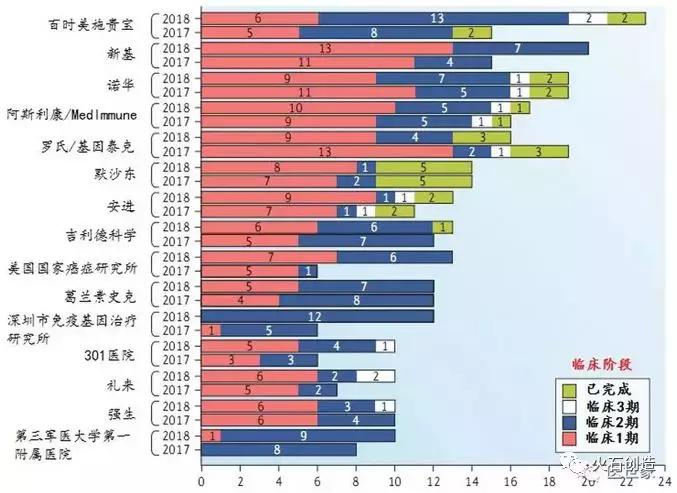 截止至2017年9月,全球共有461个学术界和工业界的组织进行了964项肿瘤免疫疗法临床项目的研发。一年后,这些组织的数量增加了42%达到655家,而临床项目的数目也增加了34%至1287项。研发项目排名前15的机构中,大型制药公司仍旧占据着主导地位,前8位均为大型制药公司,有4家为科研机构,其中3家来自中国,分别为深圳市免疫基因治疗研究院、301医院和第三军医大学第一附属医院。