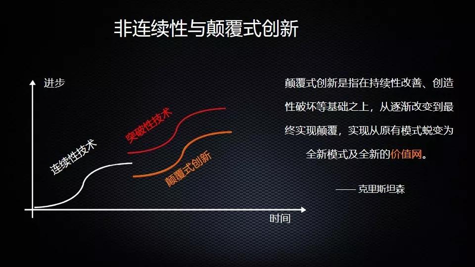 颠覆式创新,不代表完全脱离过去,而是指在持续性改善和创造性破坏等基础之上,打造一条全新的S型增长曲线,实现从原有模式蜕变为全新模式及全新的价值网。