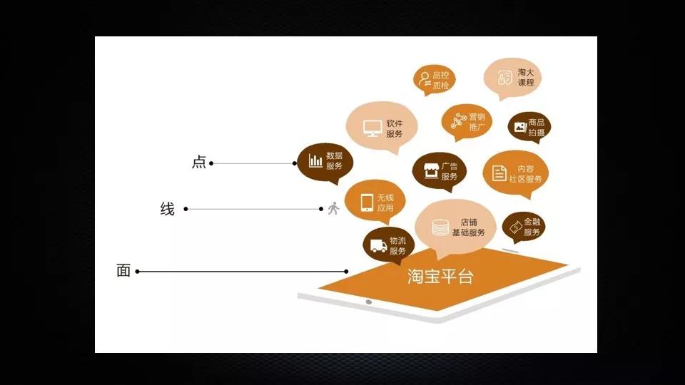 以淘宝平台为例,“点”就是在平台上为卖家提供物流服务、模特服务、软件服务甚至代运营服务的商家,卖家是典型的“线”,它连接了点、面和最终客户,淘宝这个平台就是“面”,阿里巴巴则是一个经济体。