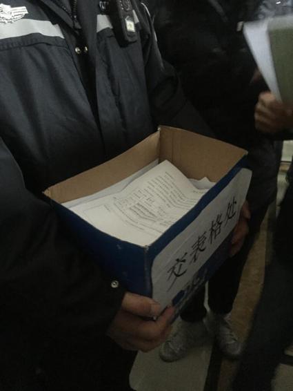 维持秩序的民警手捧纸箱回收登记表 记者 包晶晶 摄