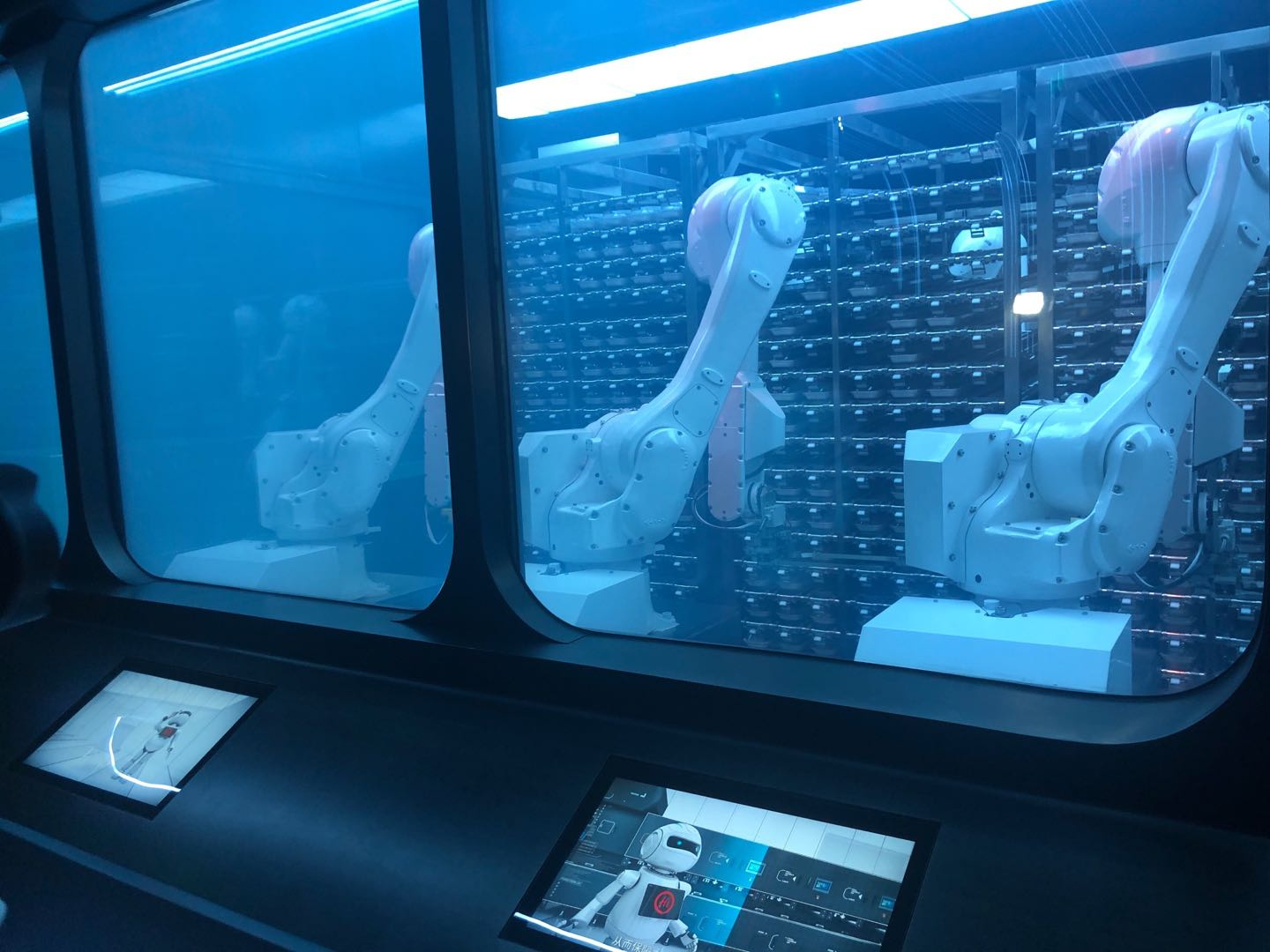 在后厨的一个工作间,隔着玻璃我看到了两排白色的机械手臂——半人高,两台一组,后排的机械臂在根据前台顾客点餐的情况抓取菜品,前排的机械臂接过分拣好的羊肉、鱼片、茼蒿,再放置到传送带上。