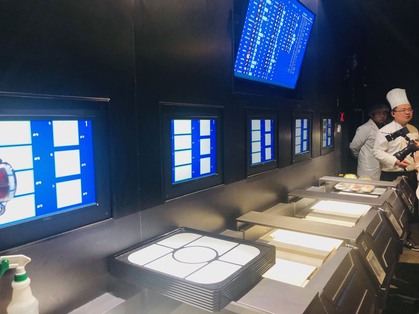 这条传送带从一个小窗口延伸出工作间,进入一台台摄像头的扫描范围,机器通过图像识别出桌号以及餐盘里对应的食物,确认无误后,它们会被送餐机器人运输到餐桌前。从下单到上桌,只需要2分钟。