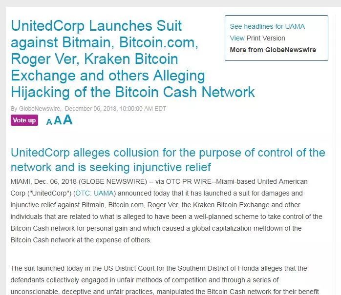 12 月 7 日,据外媒报道,总部位于迈阿密的数字电信战略公司 United American Corp(又称 United Corp)宣布,公司将对 Bitcoin Cash ABC(BTC ABC)的支持者提起诉讼,这其中包括" Bitcoin.com "公司及其创始人 Roger Ver、比特币矿机生产商 Bitmain(比特大陆)以及加密货币交易所 Kraken。
