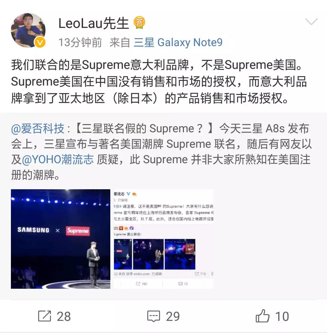 在一片质疑声中,三星电子大中华区数字化营销高级经理刘磊站出来给了个说法,他表示此 Supreme 非彼 Supreme,和三星合作的是意大利的 Supreme。