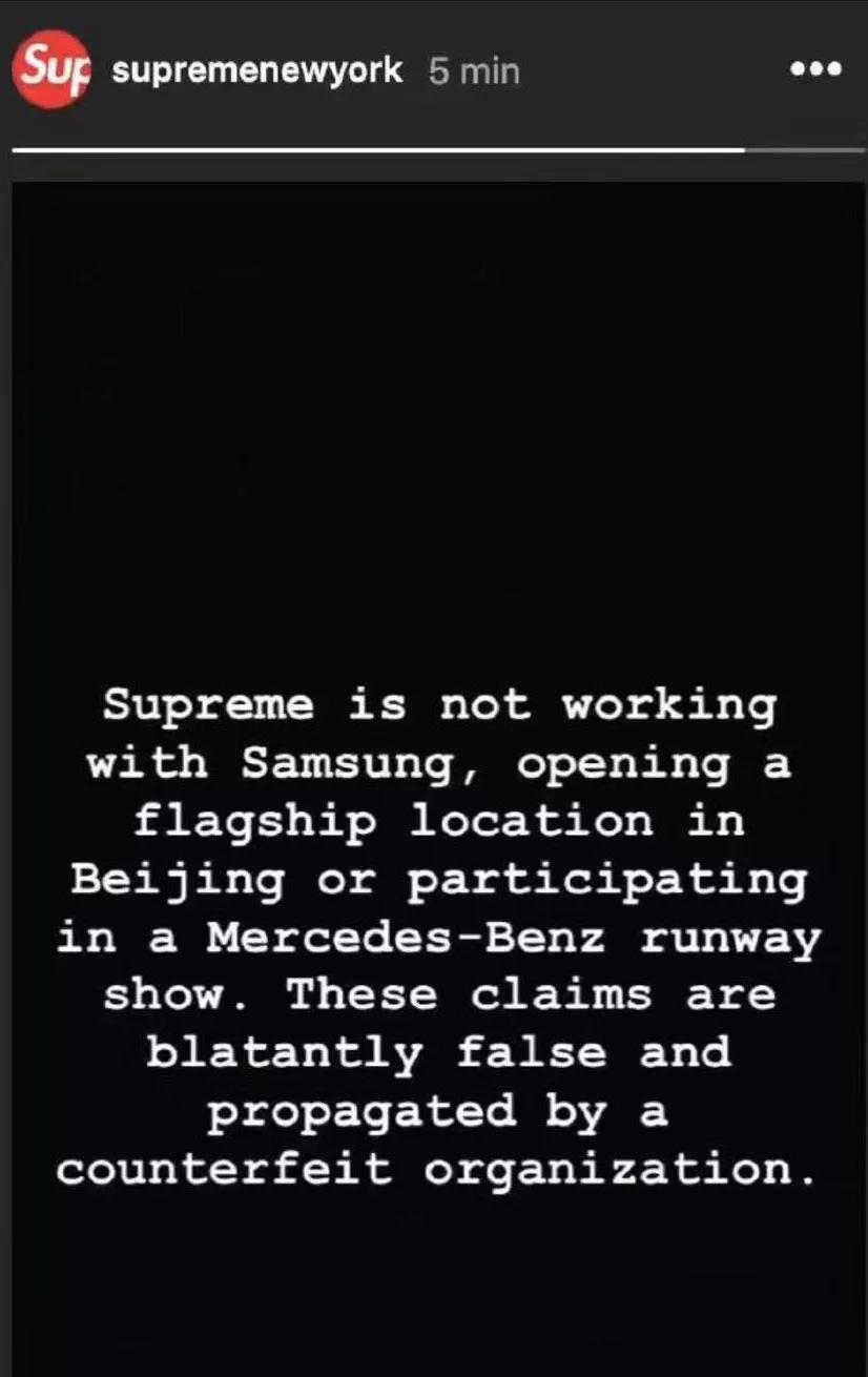 听闻自己「被合作」后,远在美国的「正主」 Supreme 很快发表声明:和三星合作?我没有,我不是,别瞎说啊。顺便提醒三星,你们被骗了。