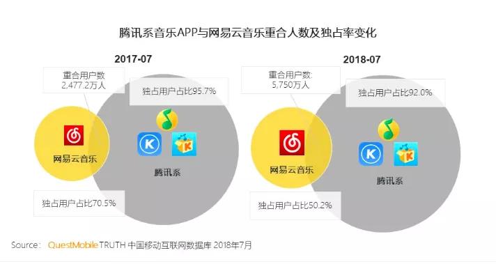 这条路现在已经被腾讯音乐证明可以走通,更多音乐平台也前赴后继。目前腾讯音乐旗下三款 app (QQ音乐、酷狗音乐、酷我音乐)占据了 76.1% 的市场份额,不过也有数据表明不同音乐平台的用户重合度越来越高,而用户粘性最高的却是市占率不高的虾米音乐,音乐平台的战争显然还没到终局。